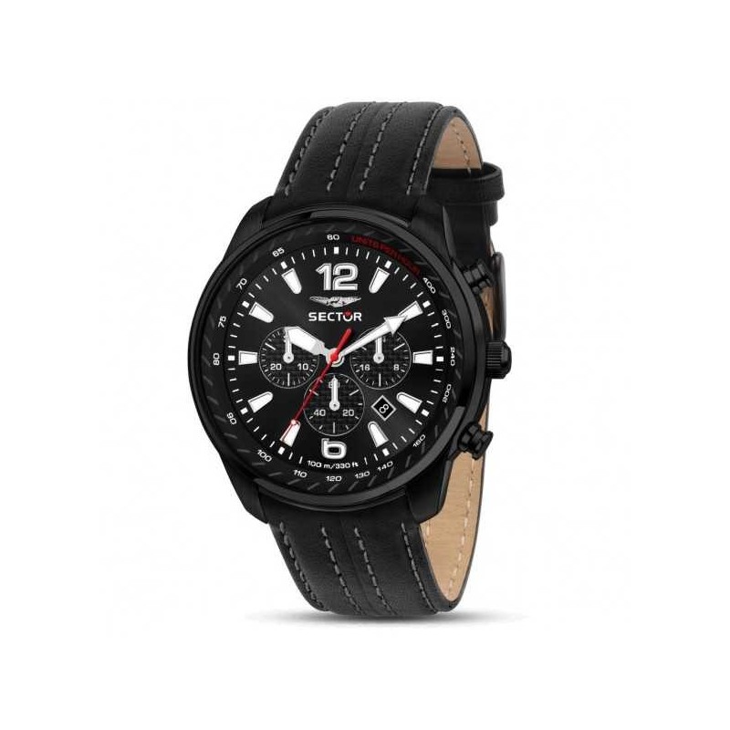Sector men's wristwatch from the Oversize collection with quartz movement and chronograph functions with date. Round stainless steel case with black IP treatment, 48 mm in diameter and 12.2 mm thick. Black analog dial with mixed baton indexes and Arabic numerals at the 12 and 6 o'clock positions only, logo at the top, and date display between 4 and 5 o'clock, mineral crystal. Black leather strap with pin buckle closure, water resistant to 10 ATM.