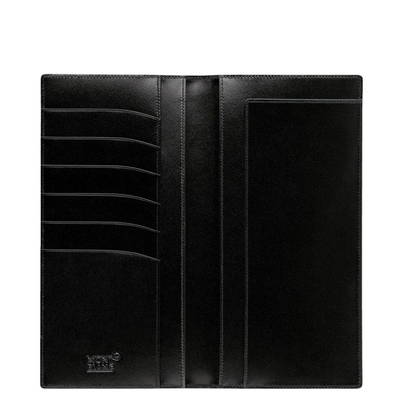 Mont Blanc men's wallet from the Meisterstück collection, made of European full-grain cowhide with unique Montblanc deep shine, chrome-tanned, dyed-through, jacquard lining with Montblanc brand name, Montblanc emblem with palladium-coated ring, 6 pockets for credit cards, 2 compartments for banknotes, 2 additional pockets. Dimensions: 95 x 15 x 190 mm.