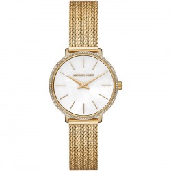 Marque : Michael Kors Genre: femme Catégorie : montres Sous-catégorie : seulement le temps Collection : Pyrer Couleur du cadran : Blanc Matière du bracelet : Acier Matériau du boîtier : Acier Taille du boîtier : 32 mm Etanchéité : 50m - 5ATM - 5bar Mouvement : Quartz Couleur du bracelet : Doré Fermeture de la sangle : bouton-pression Index :...