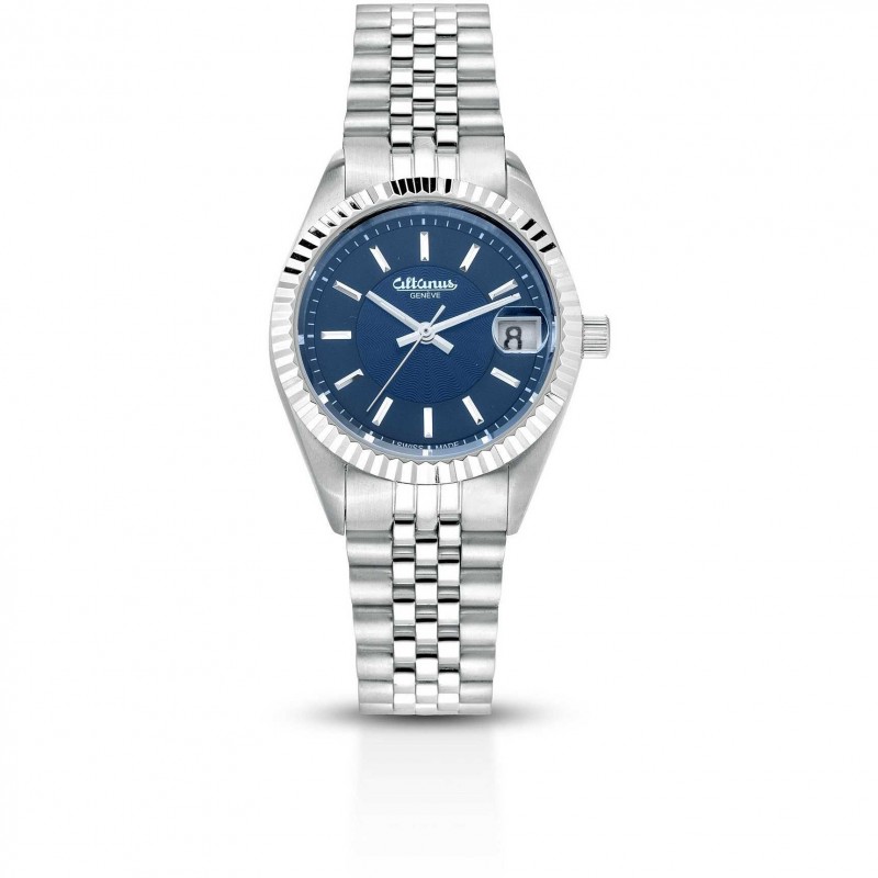 Montre Altanus pour femmes Only Time de la collection Icon. Modèle avec boîtier en acier de forme ronde de 31 mm de diamètre, cadran bleu avec index en relief et bracelet en acier argenté. Montre avec résistance à l'eau de 10 atm, mouvement à quartz et date. La référence est 16127Bz-3