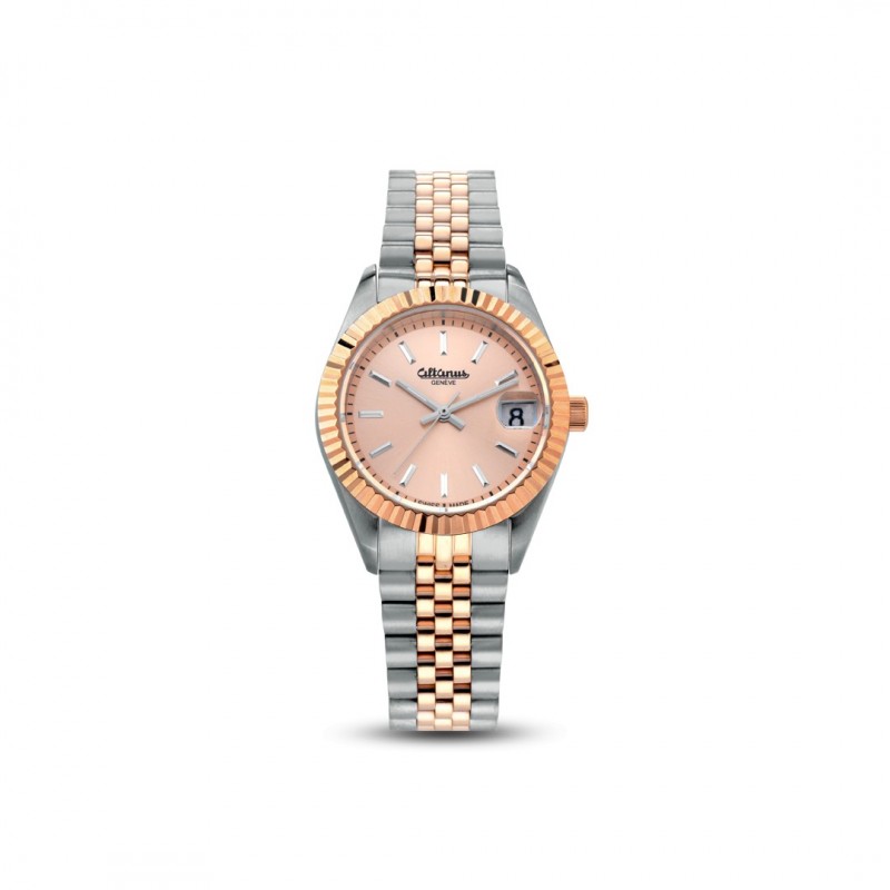 Boîtier en acier bicolore avec traitement jpg jpr, verre saphir, avec lunette cannelée et couronne vissée de 31 mm sous 10 atm de profondeur.