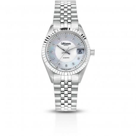 Montre Altanus pour femmes Only Time de la collection Icon. Modèle avec boîtier en acier de forme ronde de 31 mm de diamètre, cadran en nacre de couleur argent avec index à paillettes et bracelet en acier de couleur argent. Montre avec résistance à l'eau de 10 atm, mouvement à quartz et date. La référence est 16127Bzd-1
