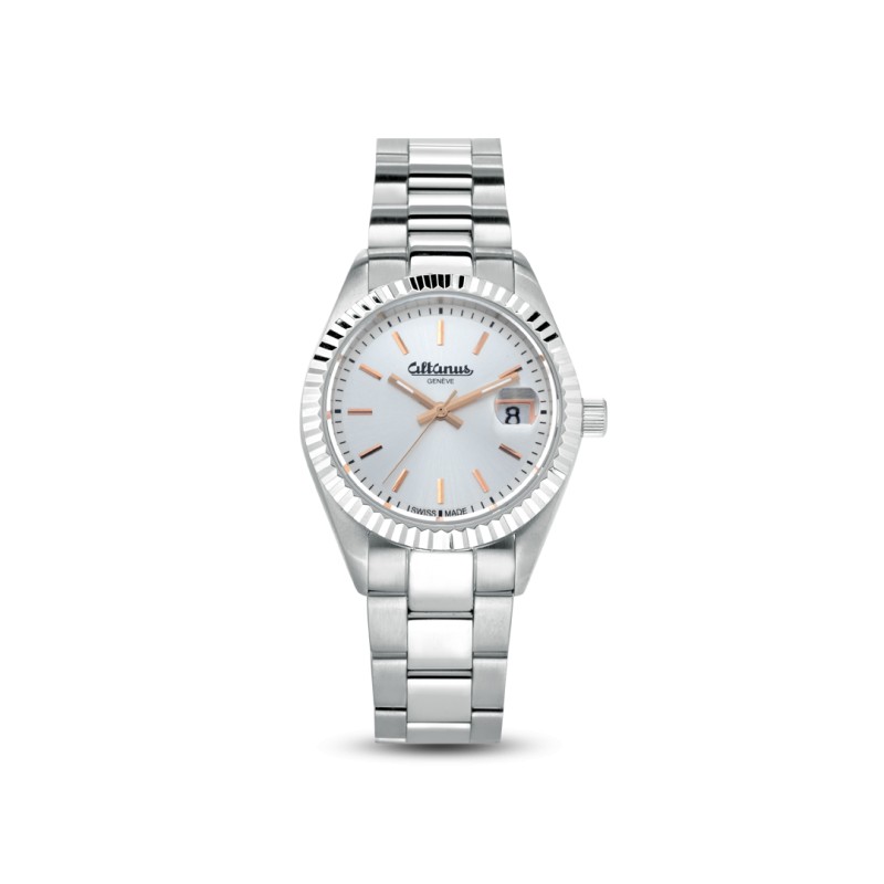 Montre Icon Boy Altanus pour homme avec boîtier en acier argenté, verre saphir, avec lunette et couronne vissée 35 mm de profondeur sous 10 atm. Mouvement à quartz Ronda 505 avec date à 3h. Bracelet en acier couleur argent avec fermoir de sécurité. Cadran : index argent rosé et fonction date, étanche 10 ATM, certifié Swiss made
