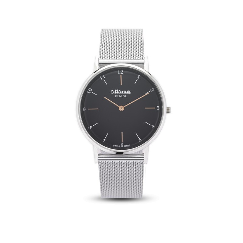 Montre fine Altanus pour homme avec boîtier en acier de 38 mm de couleur argent, fond à pression, mouvement à quartz ronda 1062, cadran noir avec chiffres arabes roses, fonction heure seule, verre saphir, bracelet en acier à mailles de Milan de couleur argent avec fermeture coulissante, étanche à 3 ATM , fabrication suisse certifiée