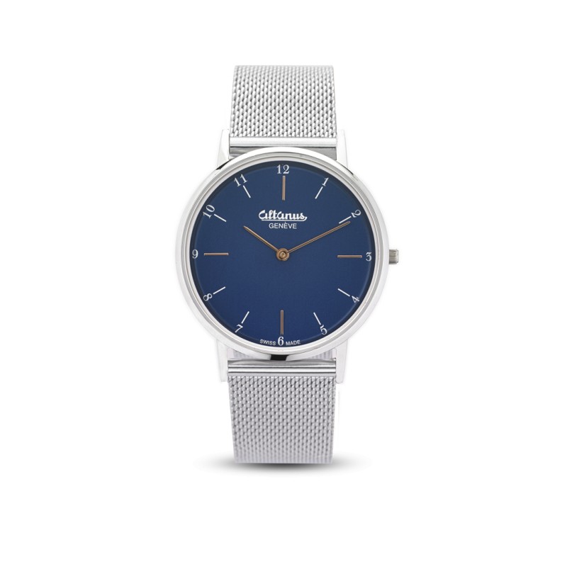 Montre fine pour homme Altanus avec boîtier en acier de 38 mm de couleur argent, fond à pression, mouvement à quartz ronda 1062, cadran bleu avec index en chiffres arabes roses, fonction de temps uniquement, verre saphir, bracelet en acier à mailles de Milan de couleur argent avec fermoir coulissant, eau 3 ATM résistant, certifié swiss made