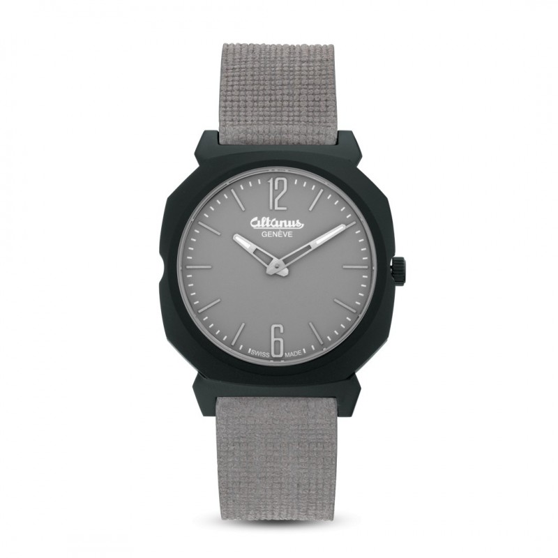 Montre homme Altanus apogeo avec boîtier en acier noir trois pièces de 41 mm, fond à pression, mouvement à quartz ronda 772.2., Cadran gris avec index argentés mixtes, fonction de temps uniquement, verre saphir, bracelet en cuir fait main avec tissu gris imprimé, étanche 5 ATM , fabrication suisse certifiée