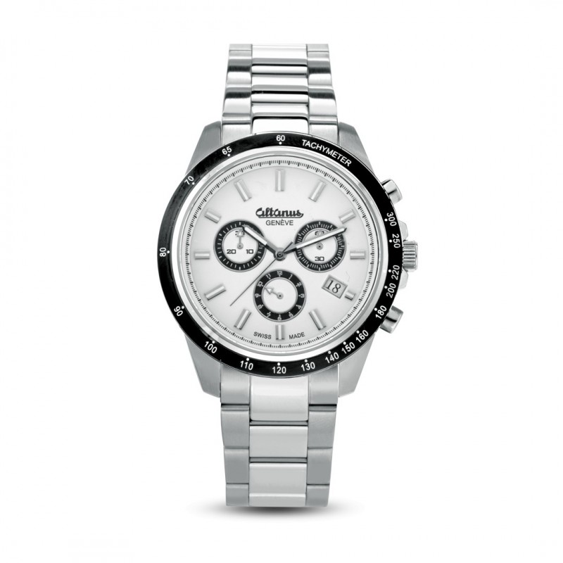 Altanus chronographe icon chrono montre pour homme avec boîtier en acier de 41 mm de couleur argentée, couronne et fond vissés, mouvement chronographe à quartz ronda 5030.D avec date à quatre heures, cadran blanc avec lunette en acier noir avec fonction date, verre minéral, bracelet en cuir en acier avec serrure sécurisée, étanche 10 ATM, certifié swiss made