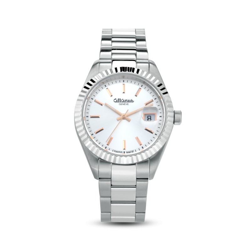 Montre homme Altanus icon man avec boîtier en acier de 39 mm de couleur argentée, couronne et fond vissés, mouvement à quartz ronda 515 avec date à trois heures, cadran argenté avec lunette moletée index bâton rosé et fonction date, verre saphir avec lentille, bracelet en acier argenté avec fermeture sécurisée, étanche 10 ATM, certificat de fabrication suisse