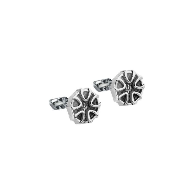 Boutons de manchette chemise homme Maserati. Bijou en acier et fibre de carbone de couleur argent et noir et de 22 mm de long, le poids correspond à 14 grammes.