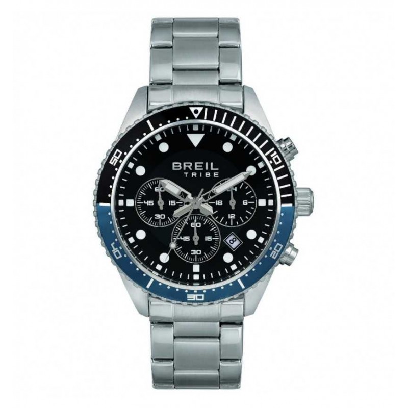 Montre chronographe de la collection Breil Sail pour homme. Couleur du boîtier : argent ; couleur du cadran : noir avec détails bleus ; couleur du bracelet : argent. Boîtier de 42 mm de diamètre en acier inoxydable 316L satiné, cadran avec double finition polie, date et sphères avec luminescent. Verre minéral. Bracelet en acier inoxydable 316L et fermeture à bouton-poussoir et fermoir de sécurité. Mouvement à quartz PE902. Classification de résistance à l'eau (WR) 10 atm : convient pour la natation, le yachting, la plongée en apnée, le canotage.