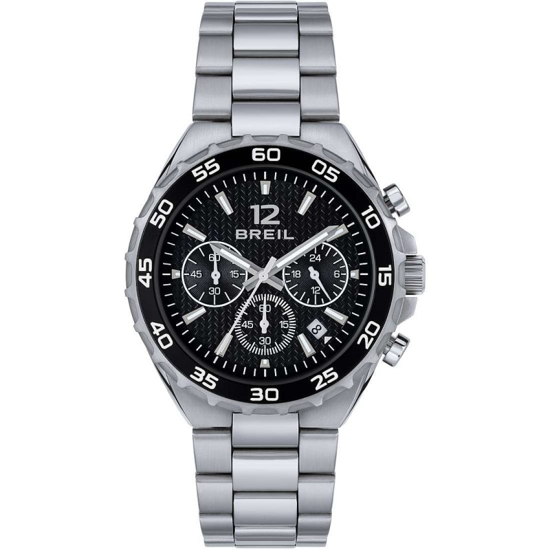 Montre chronographe Breil pour homme de la collection Highway. Montre chronographe avec boîtier de 42 mm en acier avec finition bilux. Cadran noir avec motif et détails blancs, lunette en aluminium noir avec détails blancs, aiguilles et index argentés avec luminescent. Aiguille des secondes blanche, sous-cadrans avec motif cd et détails blancs. Bracelet en acier brossé avec partie centrale polie. Fermeture avec boutons et clip de sécurité. Fonction : guichet de date. Le verre est minéral. Le fond du boîtier est vissé. Le mouvement est à quartz tmi vd53. La résistance à l'eau est de : 5 ATM