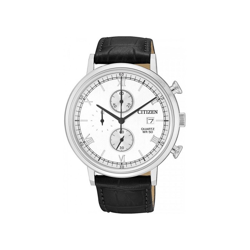 Montre-bracelet chronographe pour homme Citizen avec boîtier en acier de 41 mm de couleur argent, lunette en acier, fond vissé et couronne à pression, mouvement chronographe à quartz alimenté par pile avec fonction date, cadran blanc analogique avec index mixtes argentés et verre minéral résistant aux rayures, cuir noir bracelet avec boucle ardillon en acier, étanche 50 ATM