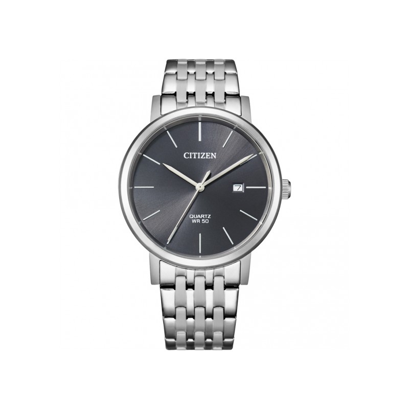 Montre-bracelet pour homme Citizen avec mouvement à quartz à pile, boîtier en acier argenté de 40 mm, fond à pression, cadran gris avec index bâtons et fonction date, verre minéral, bracelet en acier argenté avec boucle déployante, résistant à l'eau 5 ATM