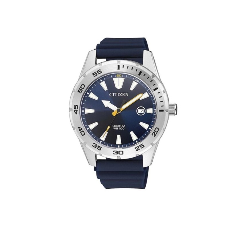 Montre poso Citizen pour homme avec mouvement à quartz à piles, boîtier en acier de 42 mm de couleur argent, fond vissé, cadran analogique bleu avec index bâtons et fonction date, verre minéral, bracelet en polyuréthane bleu avec fermeture à boucle, résistant à l'eau 10 ATM