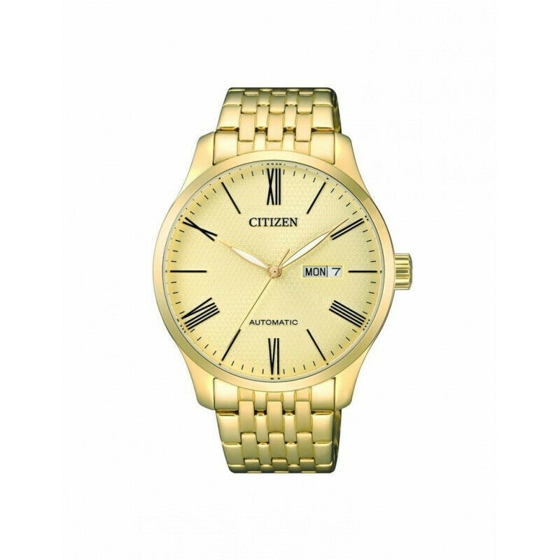 Montre-bracelet pour homme Citizen avec mouvement automatique, boîtier en acier couleur or de 40 mm, fond à pression, cadran analogique or avec index mixtes et fonction date, lunette fixe et aiguilles luminescentes, verre minéral, bracelet en acier couleur or avec boucle déployante à bouton poussoir, 5 ATM résistant à l'eau