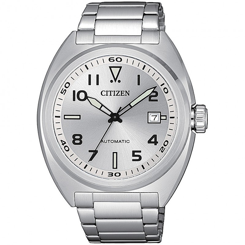 Montre-bracelet Citizen pour homme de la collection de collection. Montre avec boîtier en acier à fond vissé. Diamètre du boîtier de 42 mm. Cadran blanc avec chiffres arabes. Bracelet en acier avec fermoir de sécurité. La résistance à l'eau est de 10 atm. Mouvement mécanique à remontage automatique. Fonctions : uniquement l'heure et la date. Verre minéral.