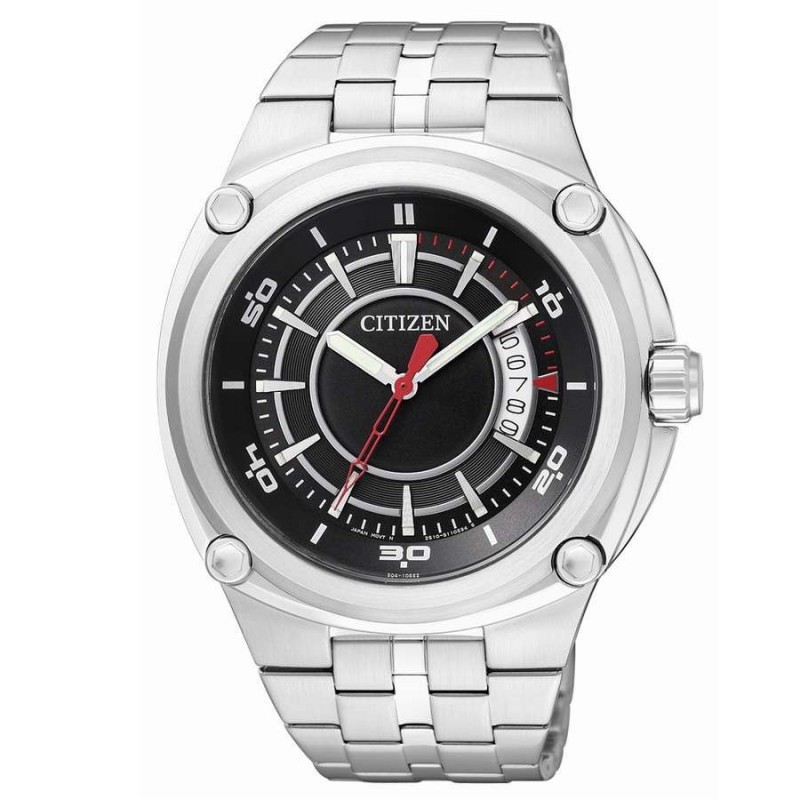 Montre pour homme Citizen time-only avec mouvement à quartz, boîtier en acier argenté de 42 mm et épaisseur de boîtier de 10 mm, cadran analogique noir avec index bâtons argentés, date, verre minéral. Bracelet en acier couleur argent avec boucle déployante. Résistance à l'eau 5 ATM