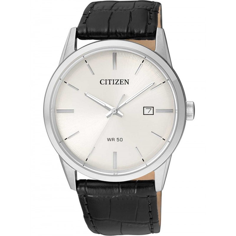 Montre-bracelet analogique Casual Citizen BI5000-01A pour homme avec mouvement à quartz, boîtier en acier inoxydable argenté de 39 mm de diamètre, fond en acier à pression, cadran analogique blanc avec index bâton argentés, fonction date, verre minéral et bracelet en cuir de veau noir avec fermeture à boucle ardillon, résistant à l'eau 5 guichets automatiques