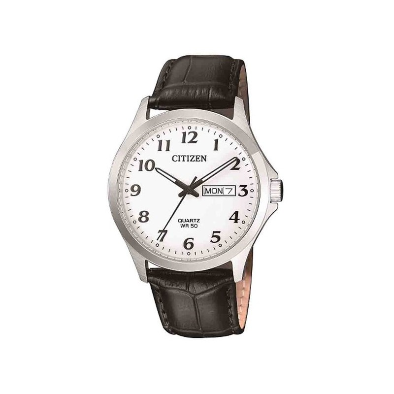 Montre pour homme Citizen avec mouvement à quartz. Boîtier en acier inoxydable de 37,5 de diamètre et de 8 mm d'épaisseur, cadran analogique blanc avec index en chiffres romains noirs, verre minéral, affichage du jour et de la date, bracelet en cuir marron avec fermeture à boucle ardillon, résistant à l'usure Eau 5 ATM
