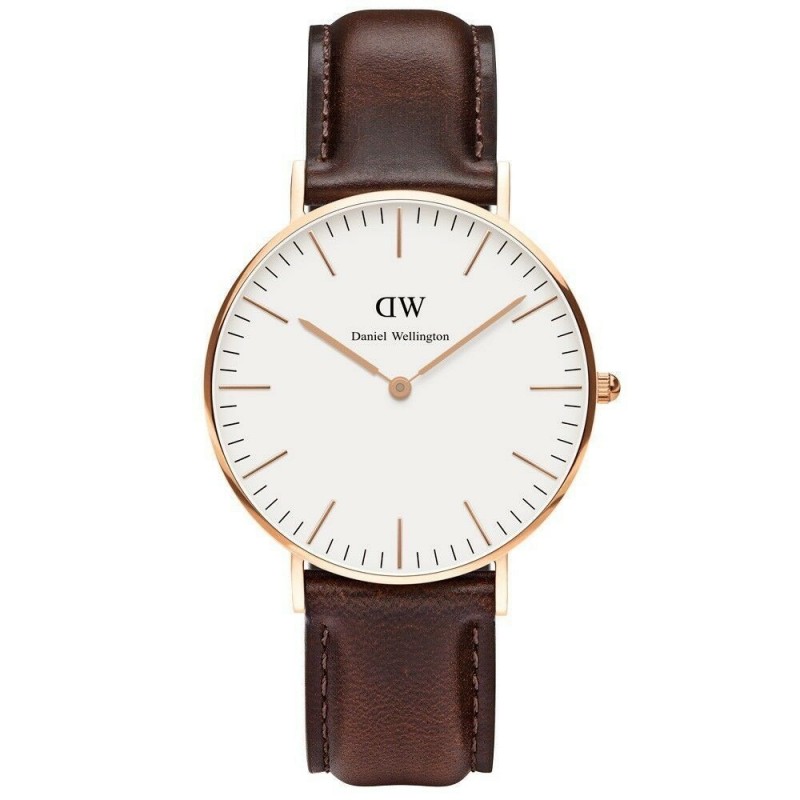 Montre Daniel Wellington, Collection Classique, modèle Bristol. Mouvement à quartz Citizen 1L22. Boîtier en acier inoxydable de 36 mm de diamètre et 6 mm d'épaisseur. Cadran blanc cassé avec liseré or rose. Bracelet en cuir marron. Étanchéité : 3 ATM.