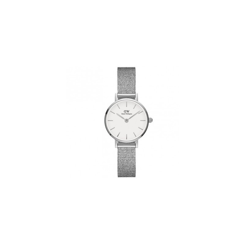 Montre-bracelet pour femme Daniel Wellington de la collection Petite Sterlin avec mouvement à quartz et fonctions horaires uniquement. Boitier de forme ronde en acier inoxydable argenté de 24 mm de diamètre et 6 mm d'épaisseur, cadran analogique blanc avec index bâtons argentés, verre minéral. Bracelet en maille milano en acier inoxydable argenté de 10 mm de large avec glissière réglable et fermoir à cliquet avec cran de sécurité, étanche 3 ATM : résistant aux éclaboussures d'eau mais pas sous pression.