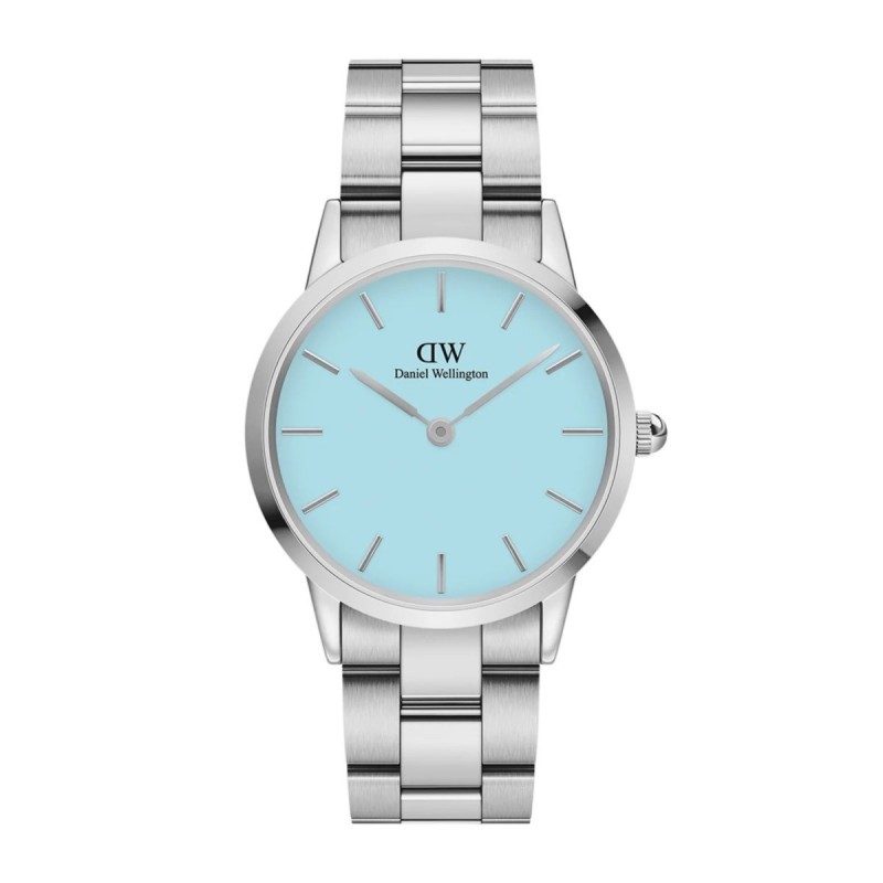 Montre-bracelet pour femme Daniel Wellington de la collection Iconic Link, à mouvement quartz et affichage de l'heure uniquement. Boîtier rond en acier inoxydable argenté de 36 mm de diamètre. Cadran analogique bleu clair avec index bâtons argentés, logo en haut, verre minéral. Bracelet en acier inoxydable argenté avec boucle déployante à bouton-poussoir. Étanchéité jusqu'à 3 ATM : résiste aux éclaboussures, mais pas à la pression de l'eau.