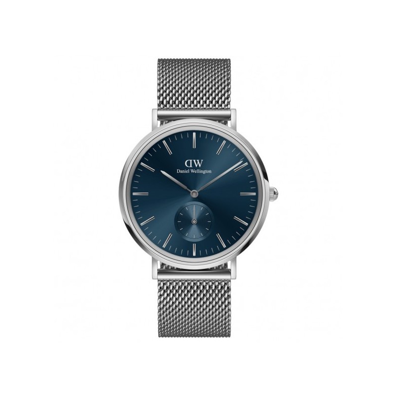 Montre-bracelet pour homme Daniel Wellington de la collection Multi-Eye, à mouvement quartz et affichage de l'heure uniquement. Boîtier rond en acier inoxydable argenté, 40 mm de diamètre et 6 mm d'épaisseur. Cadran analogique bleu avec index bâtons, logo en haut et petite seconde en bas, logo en haut. Verre minéral. Bracelet milanais en acier inoxydable argenté avec boucle déployante coulissante réglable et fermoir de sécurité. Étanchéité 3 ATM : résistante aux éclaboussures, mais non étanche à la pression.