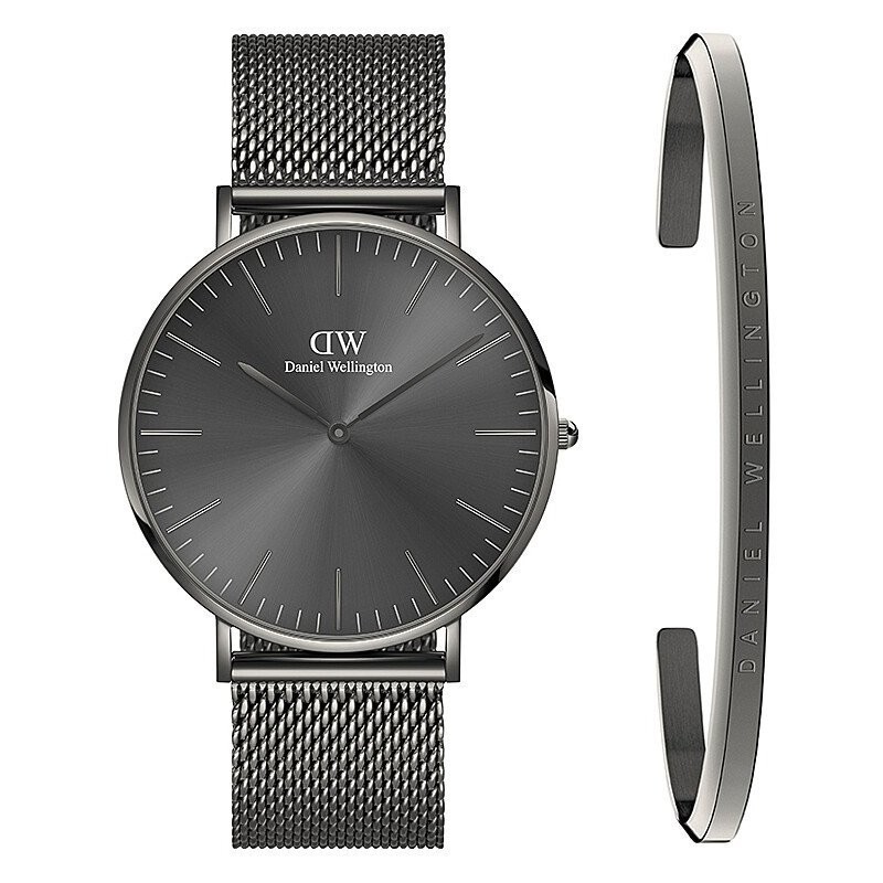 Montre-bracelet pour homme Daniel Wellington de la collection Classic Revival, à mouvement quartz et affichage de l'heure uniquement. Boîtier rond en acier inoxydable gris anthracite de 40 mm de diamètre et 6 mm d'épaisseur, avec fond clipsé. Cadran analogique gris avec index bâtons, logo en haut, verre minéral. Bracelet milanais en acier inoxydable gris anthracite avec boucle déployante réglable et fermoir de sécurité, accompagné d'un bracelet manchette Classic Cuff, tous deux en élégant gris anthracite. Étanche à 3 ATM : résiste aux éclaboussures, mais n'est pas étanche à la pression.