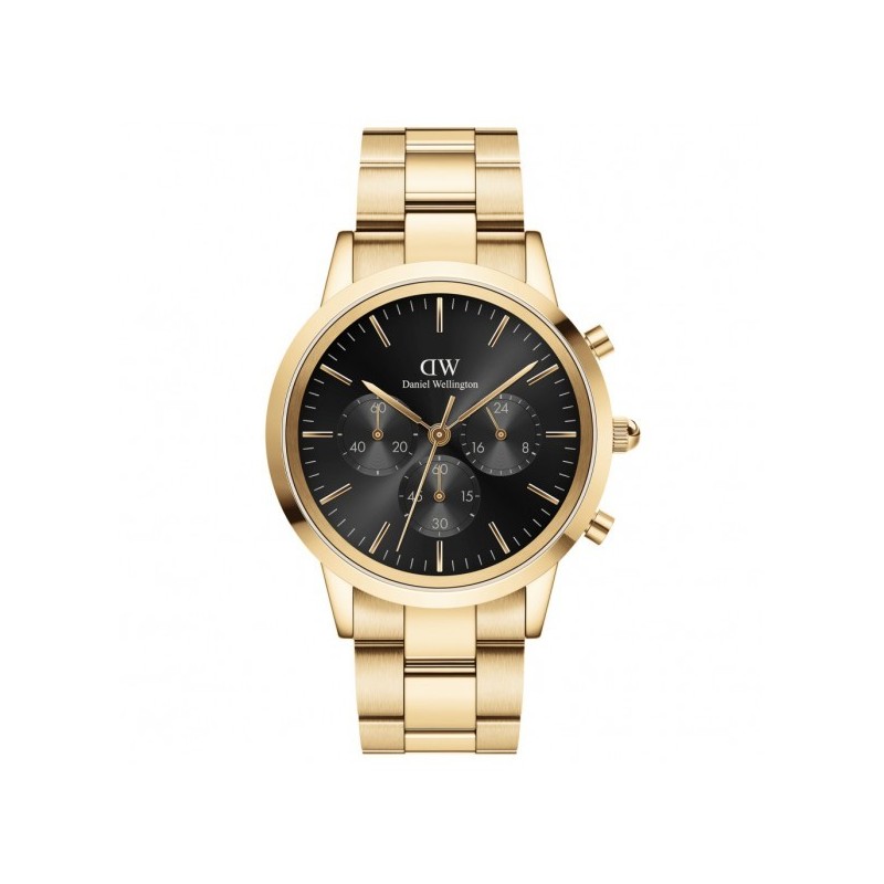 Montre-bracelet pour homme Daniel Wellington de la collection Iconic Chronograph, à mouvement quartz et fonctions chronographe. Boîtier rond en acier inoxydable doré, 42 mm de diamètre et 9 mm d'épaisseur, avec fond clipsé en acier. Cadran analogique noir soleillé avec index bâtons, logo en haut, verre minéral. Bracelet en acier inoxydable doré avec boucle déployante à bouton-poussoir, étanchéité 5 ATM : résistante aux éclaboussures mais non étanche à la pression.