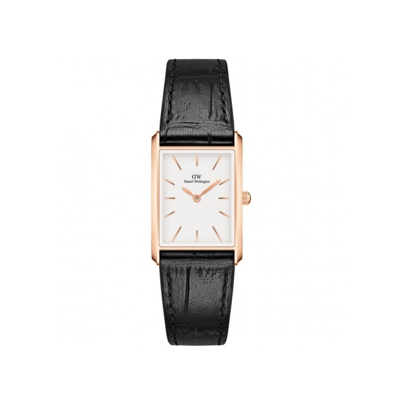 Montre unisexe Daniel Wellington de la collection Quadro, modèle The Bound, à mouvement quartz et affichage de l'heure uniquement. Boîtier rectangulaire en acier inoxydable doré rose (32 mm x 22 mm), fond clipsé en acier. Cadran analogique blanc avec index bâtons dorés rose, logo en haut, verre minéral. Bracelet en cuir noir avec boucle ardillon. Étanchéité 3 ATM : résistante aux éclaboussures, mais non étanche à la pression.