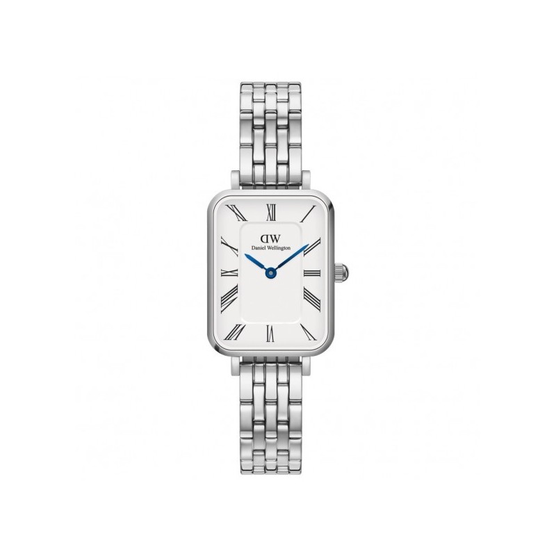 Montre-bracelet femme Daniel Wellington de la collection Quadro, à mouvement quartz et affichage de l'heure uniquement. Boîtier rectangulaire en acier inoxydable argenté (20 mm x 26 mm, 6 mm d'épaisseur) avec fond clipsé. Cadran analogique blanc avec index romains et aiguilles bleues, logo en haut, verre minéral. Bracelet en acier inoxydable argenté avec boucle déployante à bouton-poussoir. Étanchéité 3 ATM : résistante aux éclaboussures, mais non étanche à la pression.