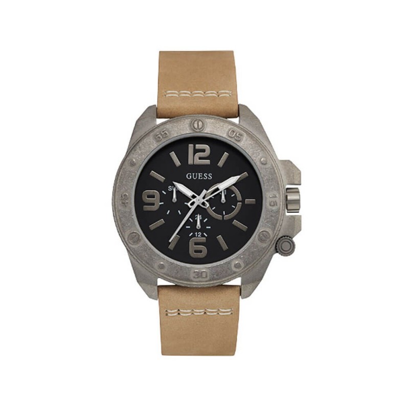 Montre-bracelet pour homme Guess only time, collection Viper Newness Early-Spring, boîtier (46 mm) en acier satiné, cadran noir, multifonction, bracelet en cuir beige, diamètre du boîtier 46 mm, étanchéité jusqu'à 30 mètres