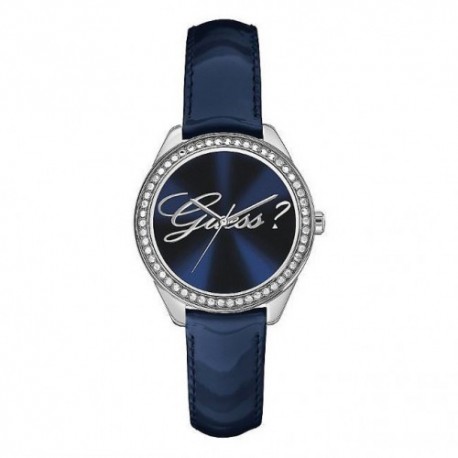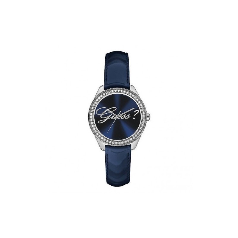 ShippingMontre-bracelet Guess pour femme unique WISHPER Collection, boîtier de 36 mm, en acier poli avec cristaux, cadran bleu avec logo, bracelet en cuir bleu, verre minéral, mouvement à quartz, étanchéité jusqu'à 30 mètres