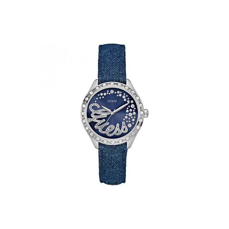 ShippingMontre-bracelet pour femme Guess collection TIME TO GIVE, mouvement à quartz, boîtier en acier inoxydable de 36 mm, bracelet : cuir véritable, cadran : bleu boîtier : ton argent, étanche à une profondeur de 50 mètres