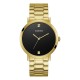 Montre-bracelet Guess pour homme avec mouvement à quartz et fonction heure uniquement. Boitier rond en acier inoxydable avec traitement IP doré, finition brillante, diamètre 44mm et épaisseur 9mm, cadran analogique noir avec point lumineux à l'index à 12h (certifié), logo sur le dessus, verre minéral. Bracelet en acier inoxydable IP doré finition polie avec boucle déployante à pression avec boutons latéraux, étanche 3 ATM : résistant aux projections d'eau mais pas sous pression.