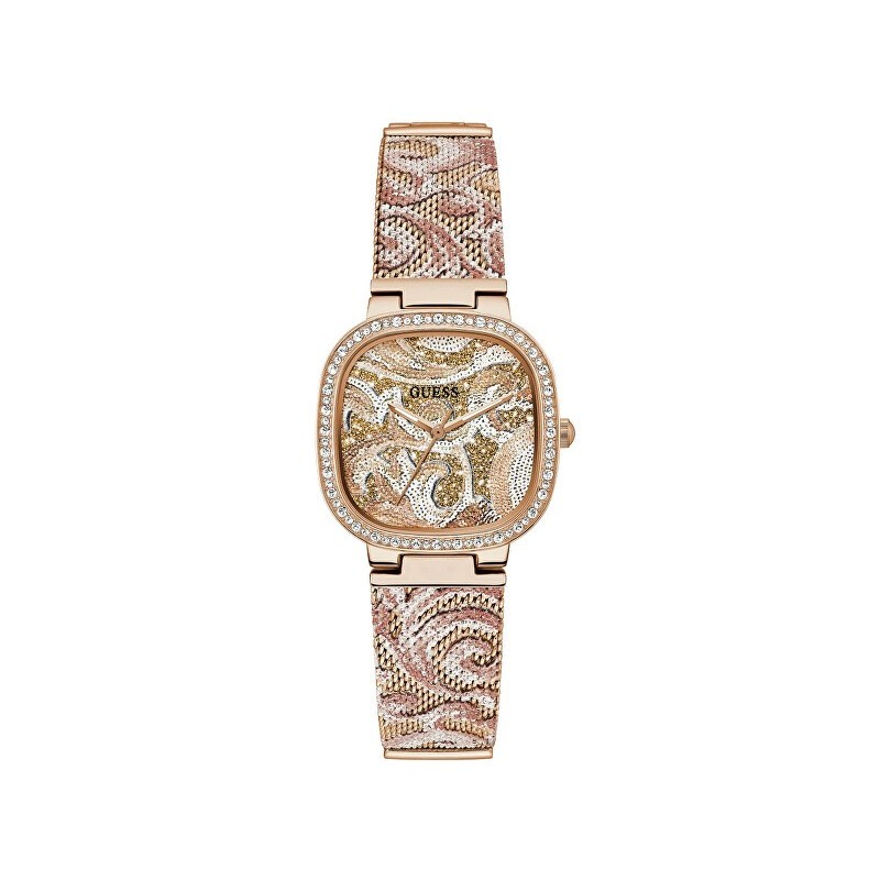 Montre-bracelet Guess pour femme, collection Tapestry, à mouvement quartz et affichage de l'heure uniquement. Boîtier carré en acier inoxydable doré rose, 32 mm de diamètre et 7,85 mm d'épaisseur, lunette en acier doré rose ornée de cristaux blancs. Cadran analogique sans index, logo en haut, verre minéral. Bracelet en acier inoxydable assorti au cadran et boucle déployante invisible. Étanchéité 3 ATM : résistante aux éclaboussures, mais non étanche à la pression.
