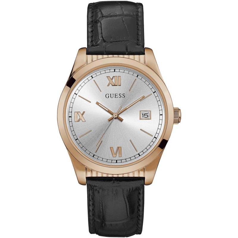 Montre-bracelet Guess pour homme, à mouvement quartz, affichage de l'heure et de la date. Boîtier rond en acier inoxydable doré rose, 40 mm de diamètre. Cadran analogique argenté avec index bâtons et chiffres romains dorés rose, guichet de date à 3 heures, logo sur le dessus, verre minéral. Bracelet en cuir noir façon crocodile avec boucle ardillon. Étanchéité 3 ATM : résistante aux éclaboussures, mais non étanche à la pression.