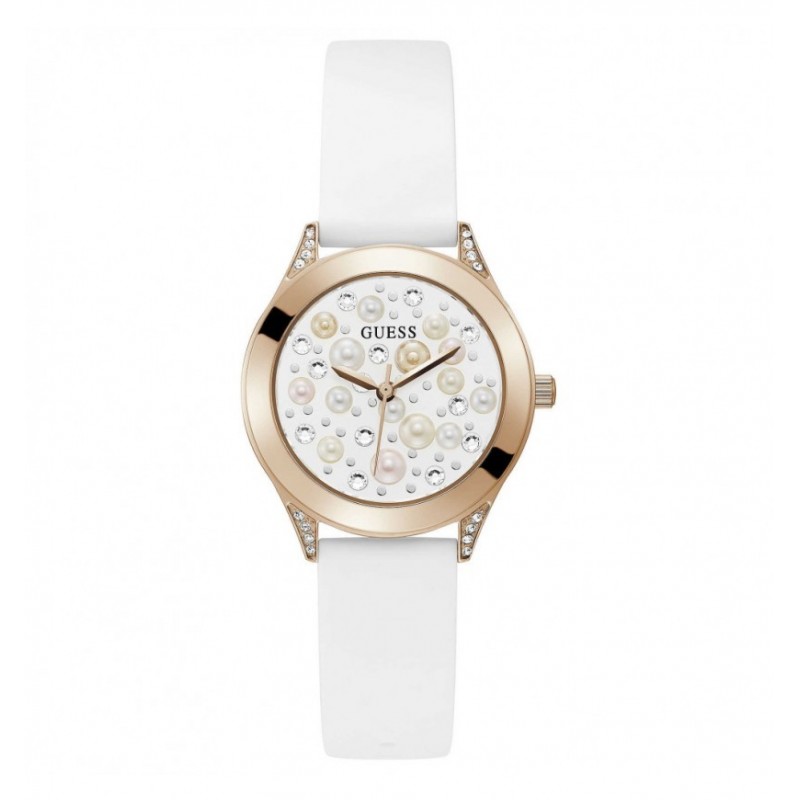 Montre-bracelet Guess pour femme, collection Pearl, à mouvement quartz et affichage de l'heure uniquement. Boîtier rond en acier inoxydable doré rose orné de cristaux blancs, lunette fixe en acier doré rose poli. Cadran analogique blanc sans index, logo sur le dessus, verre minéral. Bracelet en silicone blanc avec boucle ardillon. Étanchéité 3 ATM : résistante aux éclaboussures mais non étanche à la pression.