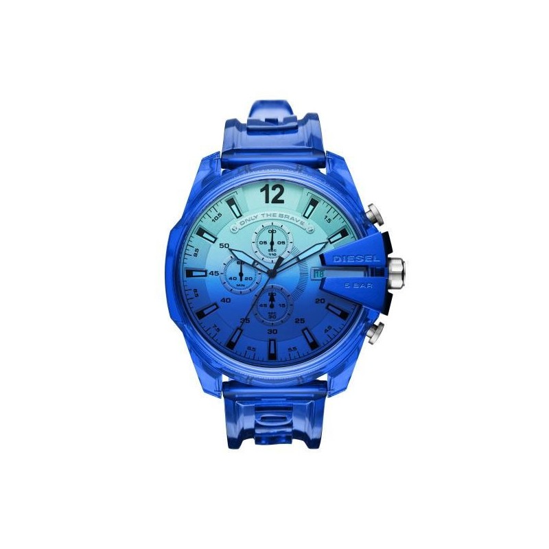Montre avec un boîtier rond de 51 mm de diamètre et 13 mm d'épaisseur. Le boîtier est en nylon bleu brillant et le verre est bleu clair. Le cadran argenté est surmonté d'une lunette en nylon bleu brillant. Le bracelet en polyuréthane bleu brillant est muni d'une boucle ardillon.