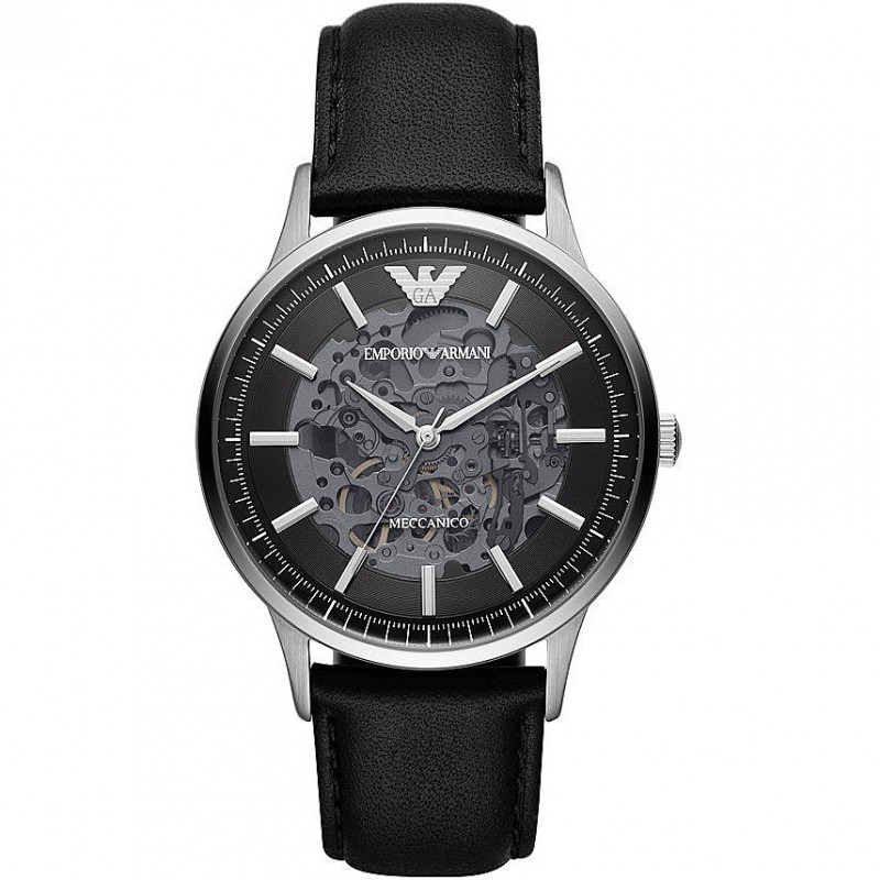 Montre automatique pour homme Emporio Armani. Montre automatique avec boîtier rond de 43 mm et 12 mm d'épaisseur en acier inoxydable avec finition polie/satinée, couleur argent. Le verre est transparent et le cadran est noir. La bague a une finition satinée, couleur argent. La distance des pattes est de 22 mm. Le bracelet est en cuir noir avec une finition brillante. Sangle avec boucle ardillon. La résistance à l'eau est de 5 atm. Le mouvement est automatique.