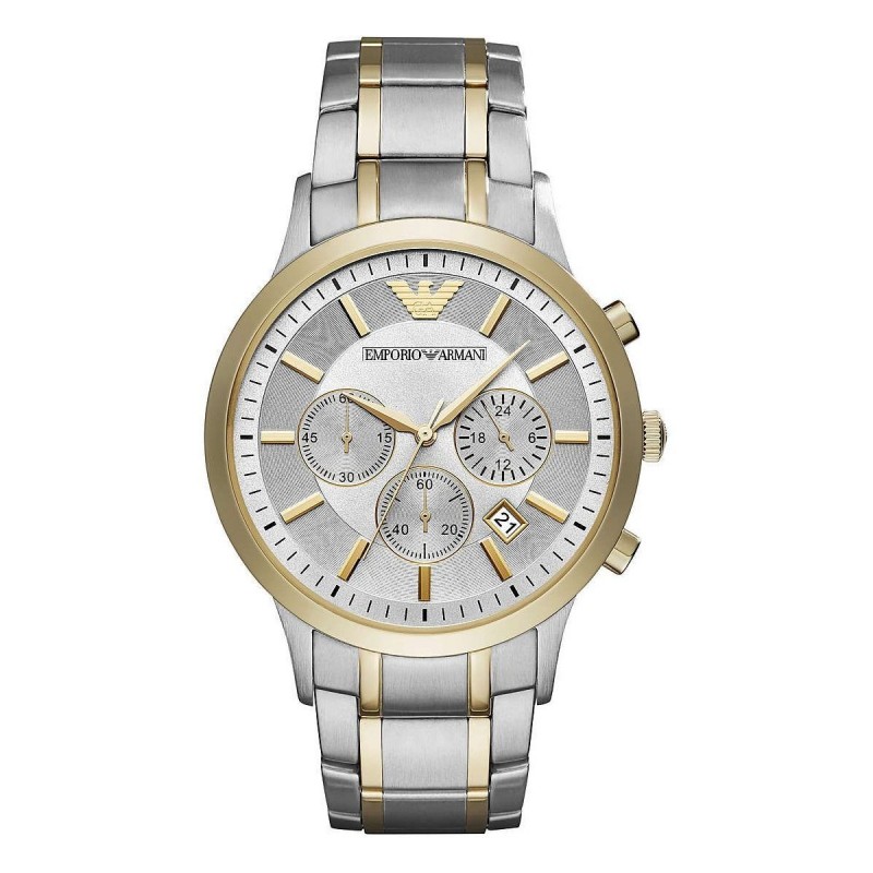 Montre chronographe Emporio Armani pour homme. Le boîtier est en acier inoxydable avec une finition polie et satinée, bicolore argent et or. Le diamètre est de 43 mm et l'épaisseur de 11 mm. La montre a un cadran argenté avec index géométriques dorés et fonction date, verre minéral transparent, lunette en acier inoxydable avec une finition dorée brillante. La distance des pattes est de 22 mm. Le bracelet a un bracelet en acier inoxydable avec une finition polie et satinée bicolore argent et or. Fermeture déployante avec cran de sécurité, résistance à l'eau 5 ATM. Le mouvement est à quartz, chronographe.