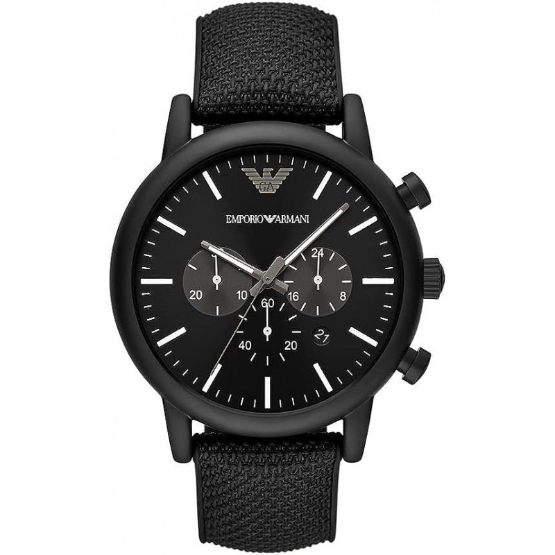 Montre-bracelet pour homme Emporio Armani de la collection Watches ea24 avec mouvement à quartz et fonction chronographe avec date. Boîtier en acier inoxydable IP noir de 46 mm de diamètre x 9 mm d'épaisseur, cadran analogique noir avec sous-cadrans sphériques pour les heures, les minutes et les secondes, index bâton, affichage de la date entre 4 et 5 heures, logo sur le dessus, verre minéral. Bracelet en cuir noir avec finition brillante et fermeture à épingle, étanche 5 ATM : résistant aux éclaboussures d'eau mais pas à la pression.