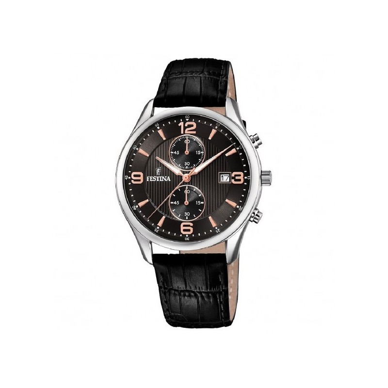 Montre-bracelet pour homme Festina de la collection Timeless Cronograph avec mouvement à quartz et fonctions chronographe avec date. Boîtier en acier inoxydable argenté d'un diamètre de 42 mm et d'une épaisseur de 10,2 mm, cadran analogique noir avec index bâtons et chiffres arabes couleur or rose, affichage de la date à 3 heures et logo à 9 heures. verre de type et fond du boîtier en acier. Bracelet en cuir noir avec imprimé crocodile et fermeture à boucle ardillon, étanche 3 ATM : résistant aux éclaboussures d'eau mais pas à la pression.