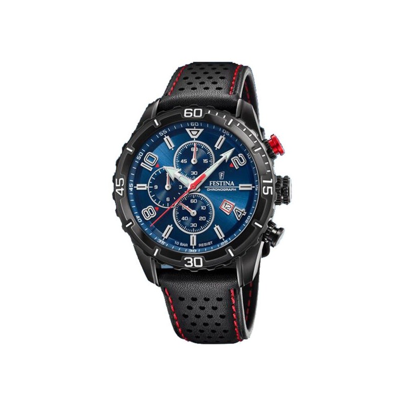 Montre-bracelet pour homme Festina de la collection Chrono Sport avec mouvement à quartz Miyota 0s10 avec fonctions chronographe avec date. Boîtier en acier inoxydable avec traitement pvd noir d'un diamètre de 45mm et d'une épaisseur de 12,25mm, lunette unidirectionnelle en acier pvd noir avec marqueur minute, cadran analogique bleu avec index bâtons mixtes et chiffres arabes, affichage de la date à 4h, logo à 3h heures, verre minéral. Bracelet en cuir perforé noir avec fermeture à boucle ardillon et coutures rouges, étanche 10 ATM