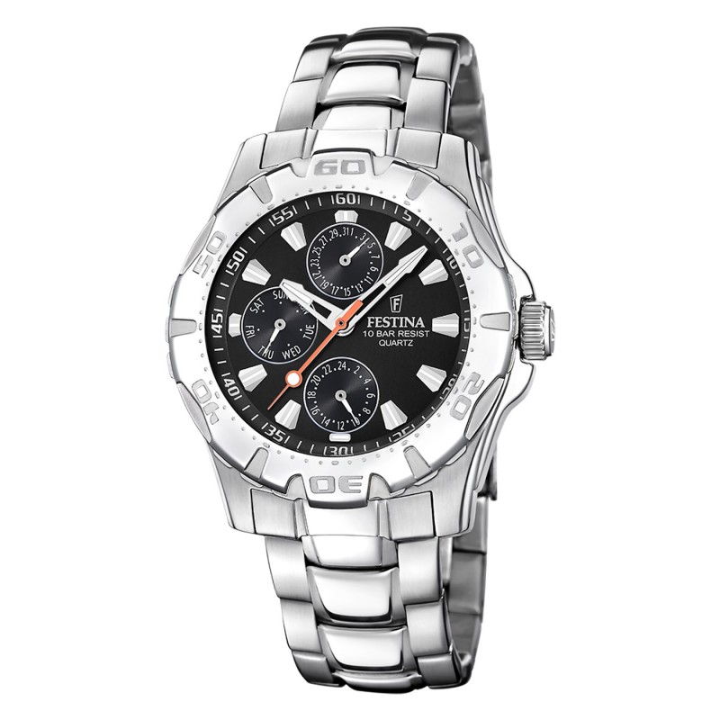 Montre-bracelet multifonction Festina pour homme de la collection Multifuncion avec mouvement à quartz Miyota 6p27. Boitier en acier inoxydable couleur argent d'un diamètre de 40mm et d'une épaisseur de 12.85mm, lunette en acier couleur argent avec marqueur minute, cadran analogique noir avec index bâtons, logo à 3h, verre minéral. Bracelet en acier inoxydable argenté avec boucle déployante et fermoir de sécurité, résistant à l'eau 10 ATM