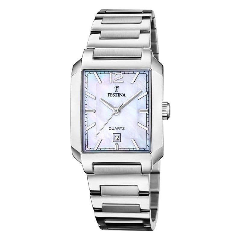 Montre-bracelet Festina pour femme, issue de la collection On the Square, à mouvement quartz, affichant l'heure et la date. Boîtier rectangulaire en acier inoxydable argenté de 33 mm de diamètre et 8,5 mm d'épaisseur. Cadran analogique blanc avec index bâtons et chiffre arabe à 12 heures, guichet de date à 6 heures, logo en haut, verre minéral. Bracelet en acier inoxydable argenté avec boucle déployante à bouton-poussoir. Étanchéité 5 ATM : résistante aux éclaboussures, mais non étanche à la pression.