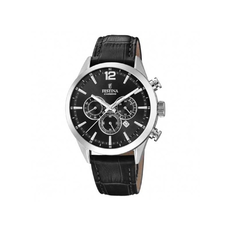 Montre-bracelet Festina pour homme, issue de la collection Timeless Chronograph, à mouvement quartz et fonctions chronographe avec date. Boîtier rond en acier inoxydable argenté, 43 mm de diamètre et 10,6 mm d'épaisseur. Cadran analogique noir avec index bâtons argentés et chiffres arabes à 12 h et 6 h uniquement, affichage de la date entre 4 h et 5 h, logo en haut, verre minéral. Bracelet en cuir noir avec boucle ardillon, étanchéité 5 ATM : résistante aux éclaboussures mais non étanche à la pression.