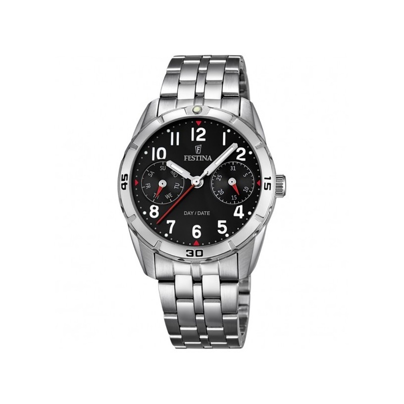 Montre-bracelet Festina pour homme, collection Junior, à mouvement quartz, affichage de l'heure et de la date. Boîtier rond en acier inoxydable argenté de 33 mm de diamètre et 8,7 mm d'épaisseur, avec lunette en acier argenté et minuterie. Cadran analogique noir avec index arabes blancs, touches de rouge, sous-cadrans ronds indiquant le jour de la semaine et le jour du mois, logo en haut, verre minéral. Bracelet en acier inoxydable argenté avec boucle déployante à bouton-poussoir. Étanchéité 5 ATM : résistante aux éclaboussures, mais non étanche à la pression.