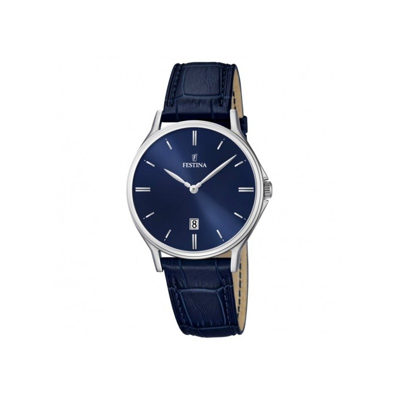 Montre-bracelet Festina pour homme, issue de la collection Correa Clasico, dotée d'un mouvement à quartz Miyota GM15 et affichant l'heure et la date. Boîtier rond en acier inoxydable argenté de 39 mm de diamètre et 6,9 mm d'épaisseur. Cadran analogique bleu avec index bâtons, guichet de date à 6 heures, logo en haut, verre minéral. Bracelet en cuir bleu avec boucle ardillon. Étanchéité 5 ATM : résistante aux éclaboussures, mais non étanche à la pression.