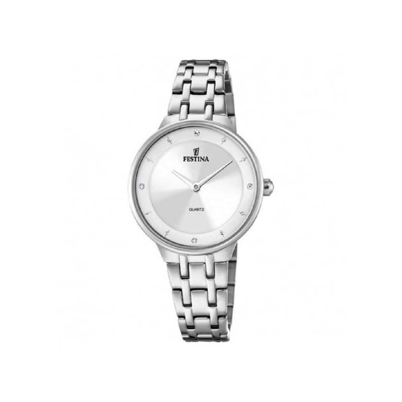 Montre-bracelet Festina pour femme, collection Mademoiselle, avec mouvement à quartz Miyota 2025-h1 et affichage de l'heure uniquement. Boîtier rond en acier inoxydable argenté, 30 mm de diamètre et 8 mm d'épaisseur. Cadran analogique argenté avec index en cristal blanc, logo sur le dessus, verre minéral. Bracelet en acier inoxydable argenté avec boucle déployante à bouton-poussoir, étanchéité 5 ATM : résistante aux éclaboussures, mais non étanche à la pression.